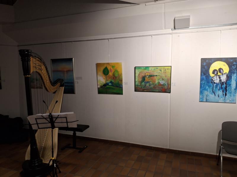 Auf der Bühne herrschte Kerzenlicht und nur eine kleine Lampe beleuchtete die Noten des sehr jungen, irische Harfe spielenden Mädchens von der Musikschule Porz. Im Hintergrund der Bühne wurde eine Diashow mit einer Auswahl der ausgestellten Bilder als Einstimmung auf die Ausstellung gezeigt.