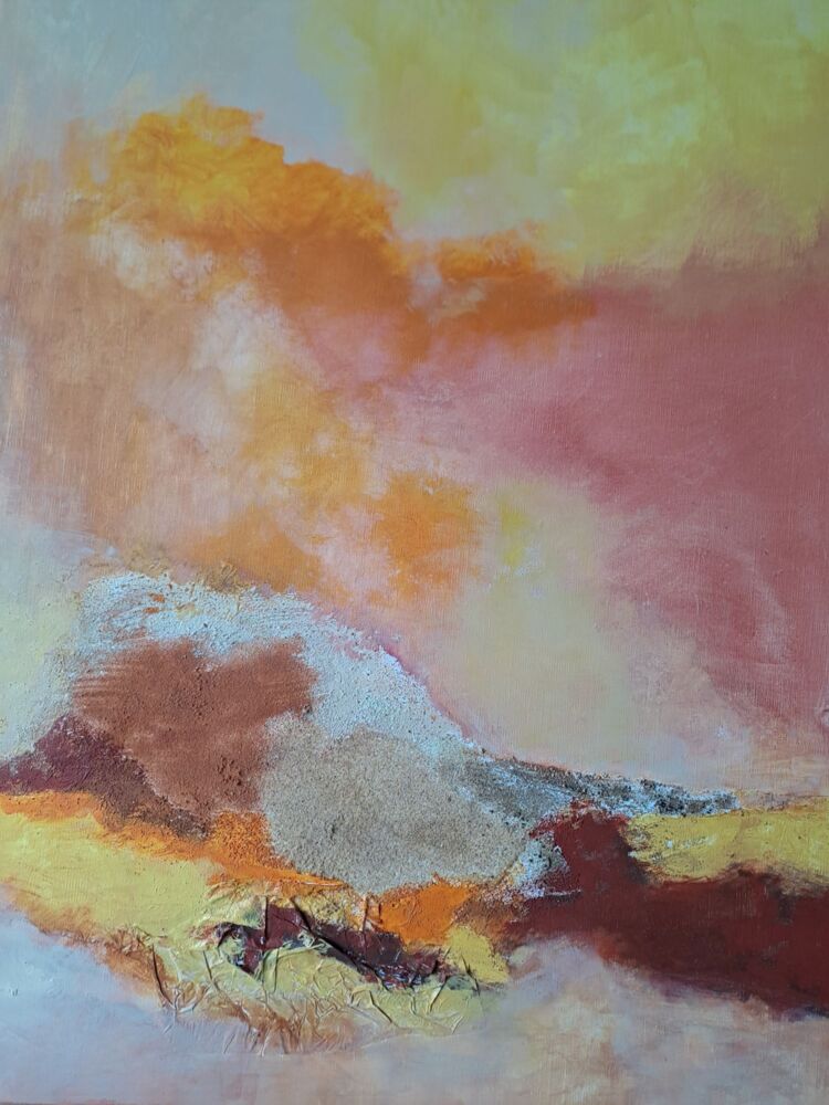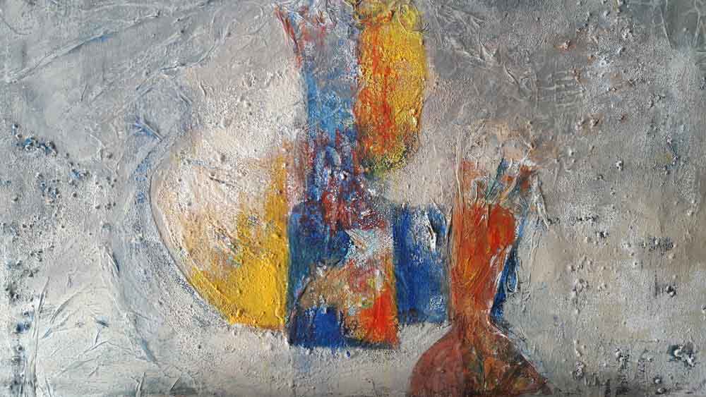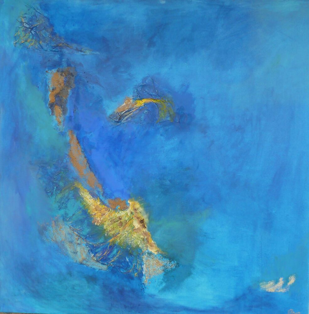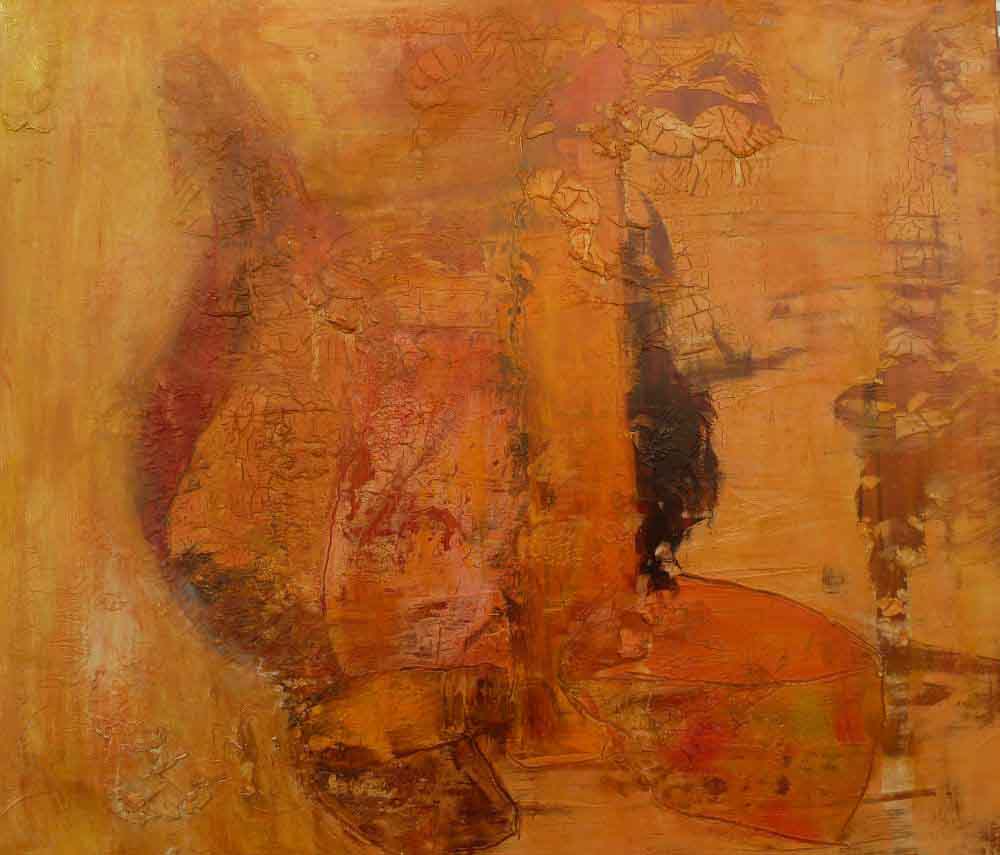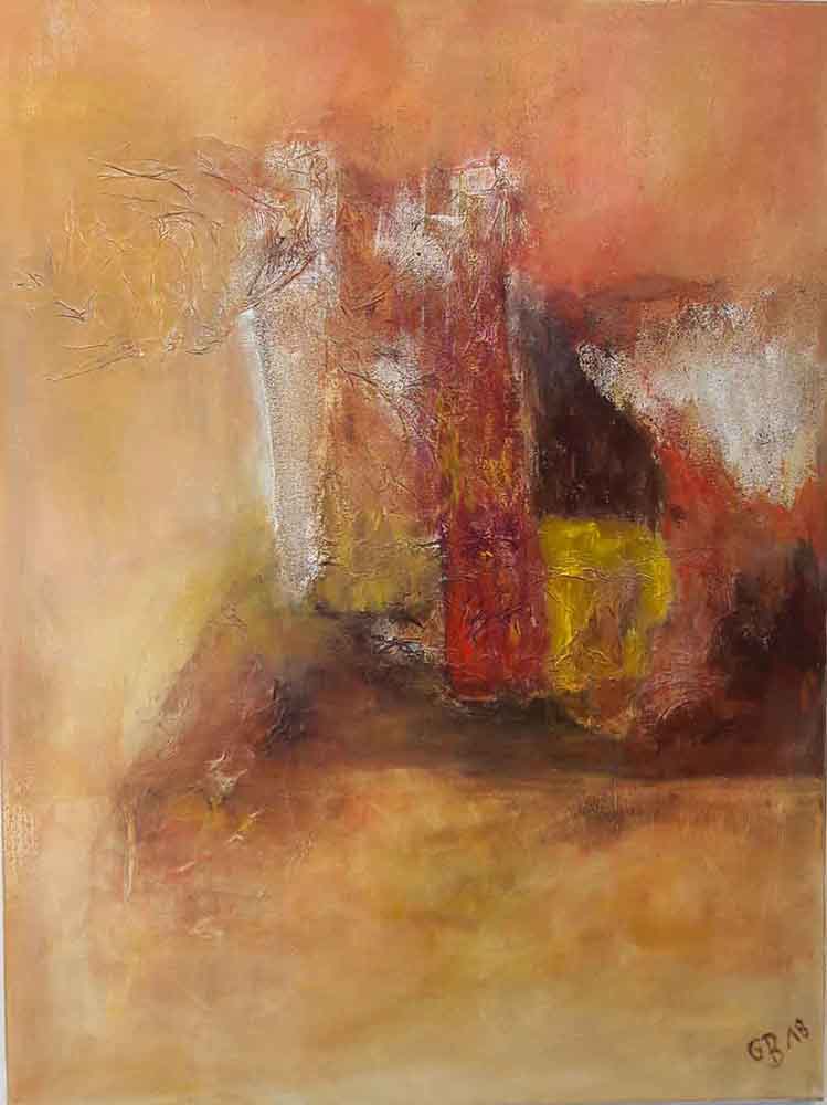 Aus zunächst zufällig entstandenen Linien und Strukturen auf dem Malgrund entstehen Kompositionen mit abstrakten Formen, die dann weiter entwickelt werden zu Themen wie Landschaften, Stillleben und Architekturen. Eingefügt werden Naturmaterialien, z.B. Sand, gesammelt von Stränden und Wüsten der Welt. Die Leinwand wird in verschiedenen Schichten mit Kreide, Lack, oder Seidenpapier bearbeitet. Im Vordergrund stehen Farben. Sie werden aus einer Grundfarbe entwickelt und entfalten daraus ihr Farbspektrum.