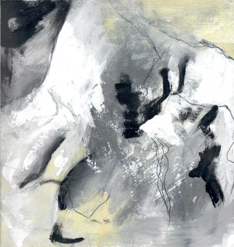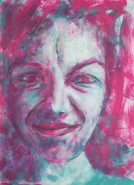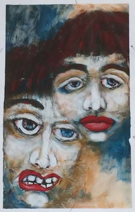 Thema: Selbstfindung und Ausdruck von Gefühlen und Eindrücken mit Fantasiefiguren und abstrakter Malerei. Es entsteht das Bild intuitiv aus zufälligen Formen und das Wort benennt am Ende. Aktuell arbeitet sie zum Thema hauptsächlich an Malereien / Mixed Media Werken von Gesichtern und Körpern (faces and figures) und nutzt die Vorlage als Inspiration und Startpunkt statt als Aufgabe zur realistischen Kopie. Bestrebt Fesseln loszulassen und freizulassen, was in ihr wohnt.