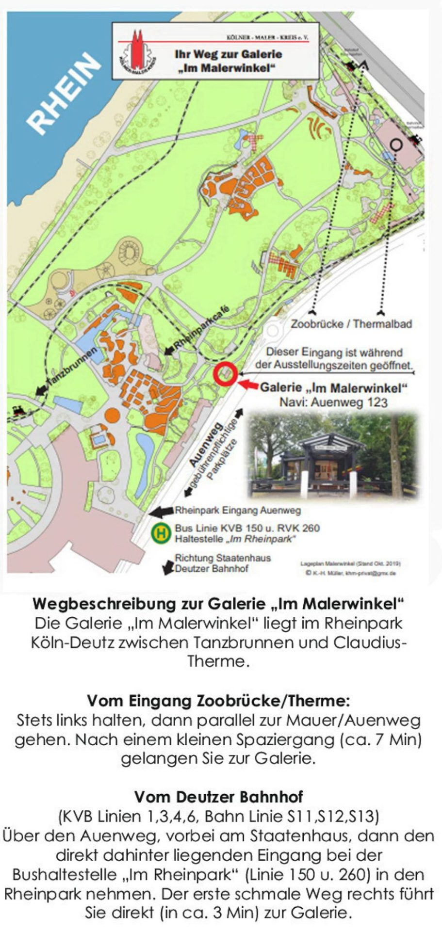 Die Galerie "Im Malerwinkel" liegt im Rheinpark in Köln-Deutz in der Nähe des alten Park-Cafés zwischen Tanzbrunnen und Thermalbad.